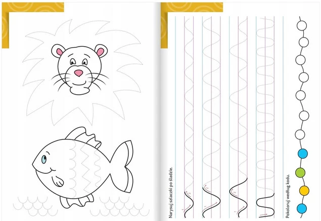 Dodatkowo szlaczkom towarzyszą proste, ale ciekawe zadania - m.in. rysowanie po śladzie i kolorowanie według kodu. Wszystkie szlaczki zostały oznaczone strzałkami, dzięki którym ich rysowanie nie będzie sprawiało problemów. Podobną pomocą jest ślad każdego szlaczka poprowadzony do końca linii. Drugą część książeczki stanowią strony przeznaczone do nauki pisania literek. Każdej literce poświęcono jedną linię. Dzięki śladowi i strzałkom już pierwsze próby pisania zakończą się sukcesem.