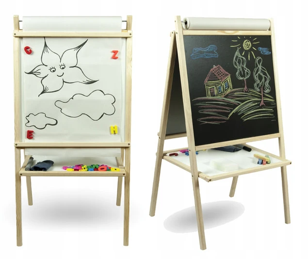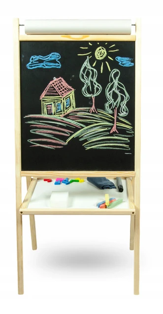 Na kreatywnego malca czeka dwustronna, rozstawiana tablica, z jednej strony tradycyjna, kredowa, a z drugiej magnetyczna, suchościeralna do pisania mazakami i ozdabiania plastikowymi literkami czy cyferkami. Jest tu także niespodzianka dla maluchów uwielbiających papierowe rysunki. Na górze stelażu umieszczono ROLKĘ PAPIERU o długości aż 15 metrów, na której powstanie wiele niezwykłych prac!
