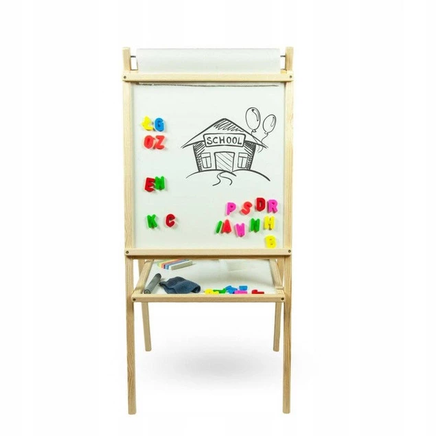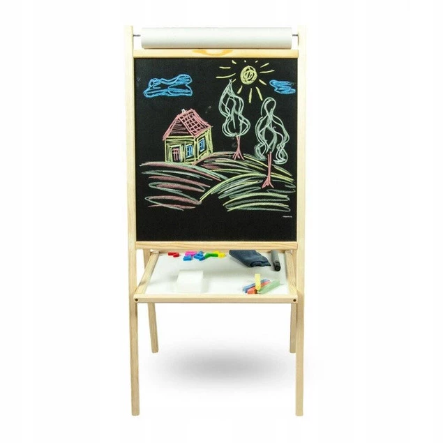 Na kreatywnego malca czeka dwustronna, rozstawiana tablica, z jednej strony tradycyjna, kredowa, a z drugiej magnetyczna, suchościeralna do pisania mazakami i ozdabiania plastikowymi literkami czy cyferkami. Jest tu także niespodzianka dla maluchów uwielbiających papierowe rysunki. Na górze stelażu umieszczono ROLKĘ PAPIERU o długości aż 15 metrów, na której powstanie wiele niezwykłych prac!