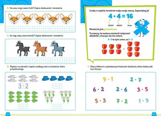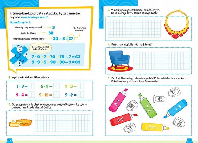 ✔Tabliczka mnożenia to zmora wielu uczniów. Nie musi tak być! Przedstawiamy książeczkę Tabliczka mnożenia, która została przygotowana z myślą o tym, by maksymalnie ułatwić maluchom naukę mnożenia. Mnożenie przez każdą liczbę jest tutaj najpierw przedstawione osobno, dzięki czemu dziecko może poćwiczyć i zapamiętać dokładnie te działania, z którymi ma największy problem, lub uczyć się całej tabliczki mnożenia, ale po kolei i systematycznie. Wielkim atutem książeczki są liczne podpowiedzi, wyjaśnienia teoretyczne i wskazówki mnemotechniczne ułatwiające zapamiętanie działań. Dodatkowo publikacja jest bardzo przejrzysta, estetyczna i zachęcająca dla oka.