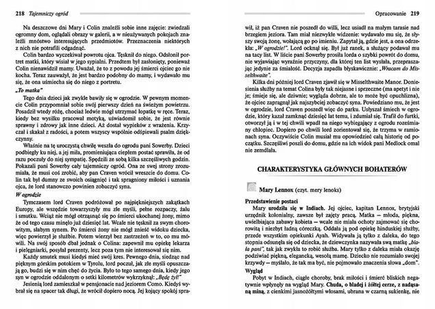 Wydanie Tajemniczego ogrodu kompletne bez skrótów i cięć w treści. W tym wydaniu znajdziesz odpowiedzi na pytania z podręcznika - "pewniak na teście", czyli wskazanie zagadnień, które zwykle pojawiają się w pytaniach z danej lektury we wszelkich testach sprawdzających wiedzę, a także w podręcznikach i na klasówkach. Książka zawiera pełen tekst lektury. Na końcu książki zamieszczono opracowanie, w którym znajduje się bardzo szczegółowe streszczenie oraz drugie skrócone, ułatwiające szybkie przygotowanie się przed lekcją. Opracowanie zawiera ponadto plan wydarzeń, wnikliwie wyjaśnioną problematykę oraz szerokie charakterystyki bohaterów.