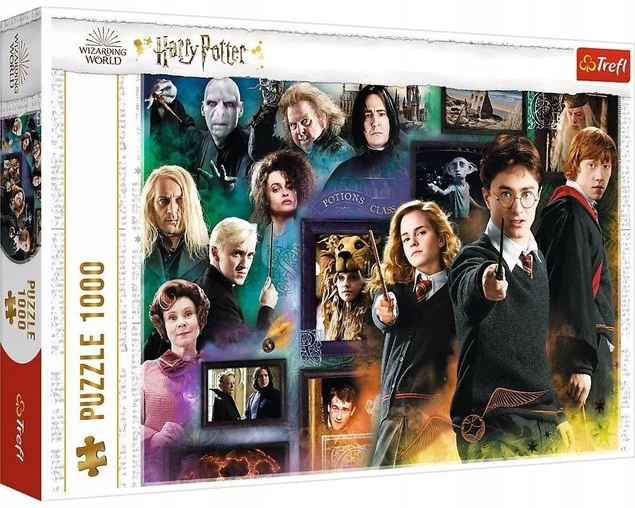 Puzzle składające się z 1000 elementów przedstawiające bohaterów z serii filmów Harry Potter. Po ułożeniu powstanie obrazek o wymiarach 683x480 mm.