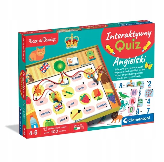 Poznaj Interaktywny Quiz – ANGIELSKI z serii Uczę się bawiąc od Clementoni. To bogaty zestaw 12 gier edukacyjnych i wiele ilustrowanych quizów, które krok po kroku oswajają dziecko z podstawowym słownictwem i prostymi zwrotami.
