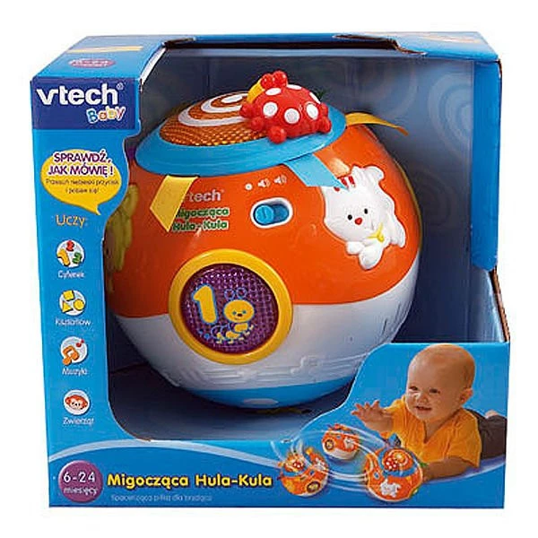 Hula Kula to interaktywna zabawka dla najmłodszych. Mechanizm samoczynnie wprawiający Kulę w ruch zachęca dziecko do stawiania pierwszych kroków i podążania za wesołymi dźwiękami i światełkami. Dzieci mogą przyciskać świecące guziczki z cyferkami i zwierzątkami oraz zapoznawać się z kolorami i kształtami. Kula gra melodie i piosenki. Dodatkowe wrażenia dotykowe i rozwój koordynacji wzrokowo - ruchowej zapewniają dziecku tasiemki, wypukłe kształty i kręcąca się biedroneczka.