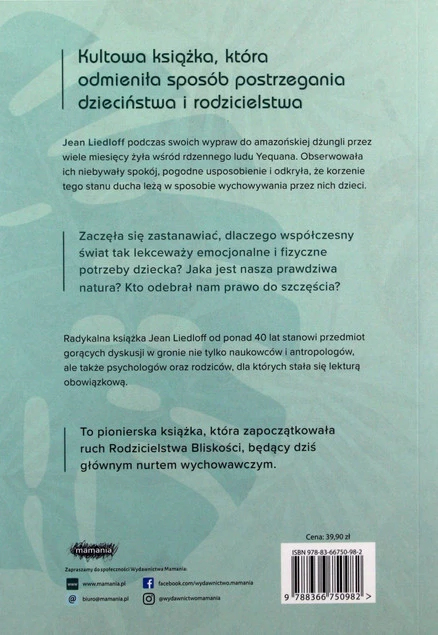 Radykalna książka Jean Liedloff od ponad 40 lat stanowi przedmiot gorących dyskusji w gronie nie tylko naukowców i antropologów, ale także psychologów oraz rodziców, dla których stała się lekturą obowiązkową.