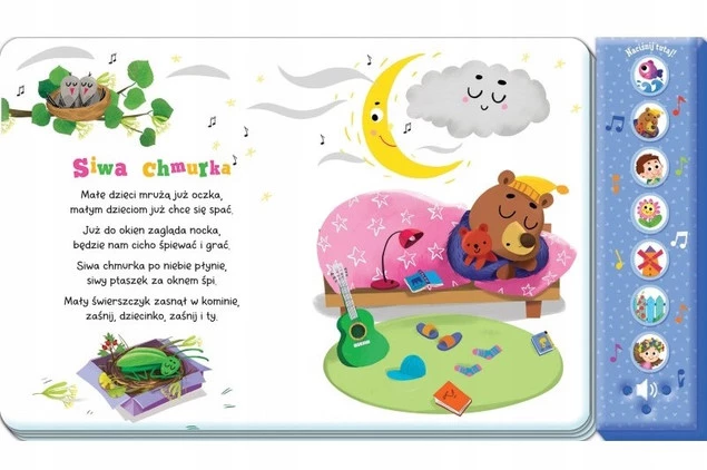 Siedem lubianych i popularnych piosenek do słuchania i czytania. Teksty przekazywane z pokolenia na pokolenie oraz melodie, które nigdy nie ulecą z pamięci. W książce znajdują się następujące piosenki: Płynie Wisła, Siwa chmurka, Mam chusteczkę, Stokrotka, O czarnym baranie, Wlazł kotek, Dorotka. Słuchaj i śpiewaj razem z nami!