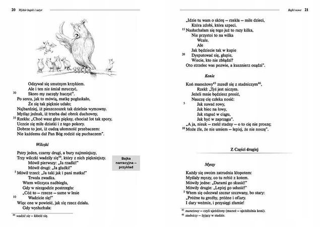 ✔Wiersze podzielono na dwie grupy - znajdują się tutaj bajki z popularnych zbiorów Bajki i przypowieści oraz Bajki nowe (m.in. Ptaszki w klatce, Kulawy i ślepy, Jagnię i wilcy, Wilczki), a także najbardziej znane satyry (Żona modna, Świat zepsuty, Pijaństwo, Do króla).