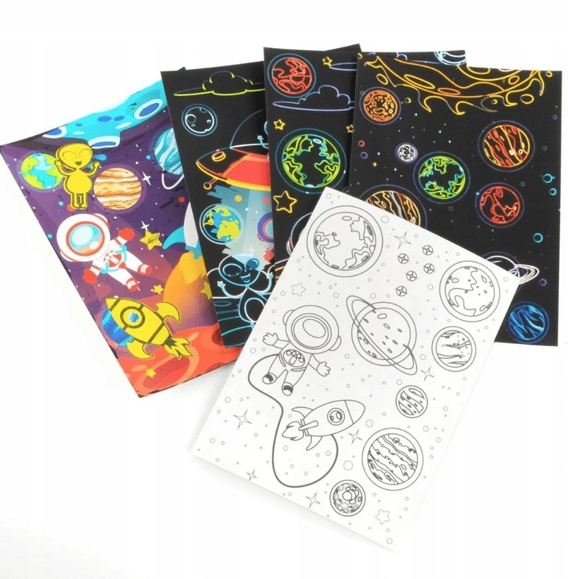 Komplet wydrapywanek i kolorowanek dla dzieci od Kidea. 6 obrazków - na jednej stronie zdrapywanka, a na odwrocie kolorowanka z motywem kosmosu. Wystarczy zdrapać czarną warstwę, by ujawnić kolorowy obrazek. Następnie odwracamy kartkę i kolorujemy. Wyciszająca i odstresowująca zabawa dla dzieci. Świetny sposób na nudę.