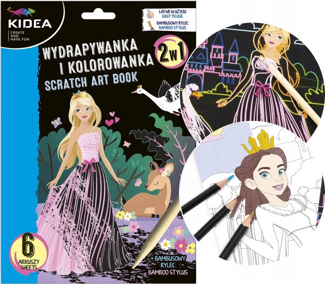 Wydrapywanka Zdrapywanka Kolorowanka KSIĘŻNICZKI 6 Arkuszy + Rysik Kidea