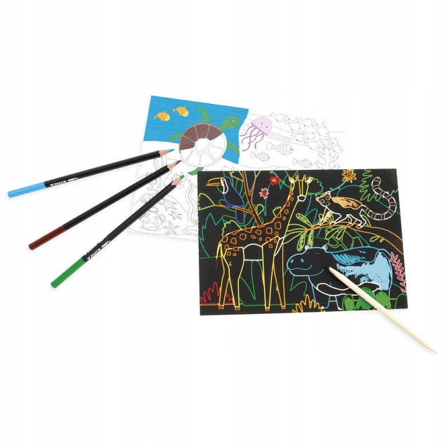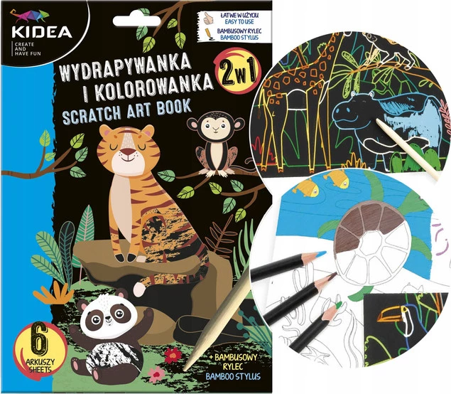 Wydrapywanka i kolorowanka w jednym od KIDEA! W zestawie znajdziesz aż 6 wydrapywanek z dzikimi zwierzetami i kolorowankami na odwrocie oraz drewniany rysik.