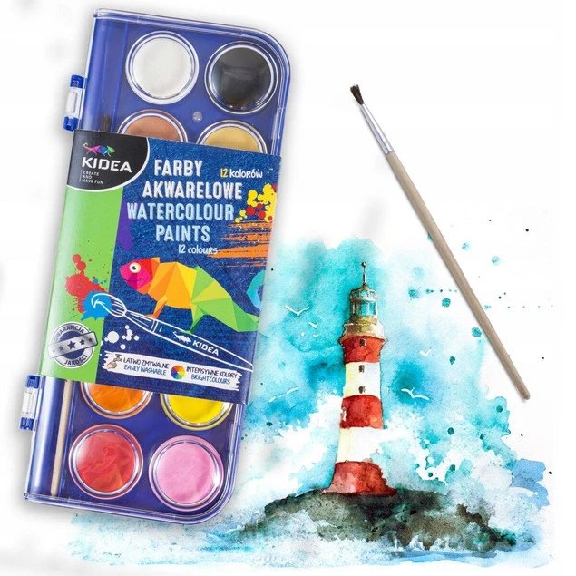 - Farby akwarelowe wodne Kidea 12 kolorów + pędzelek FA12KKA