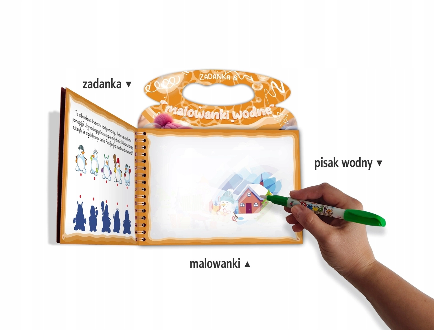 Zestaw z serii „Zadanka & Malowanki Wodne” zawiera zeszyt z zadankami i malowankami powleczonymi specjalną powłoką, która zmienia swoje właściwości pod wpływem wilgoci, oraz pisak ze zbiorniczkiem na wodę. Malowanki wielorazowego użytku – ponownie tracą kolor po wyschnięciu. Elementy zestawu nie podlegają sprzedaży osobno.