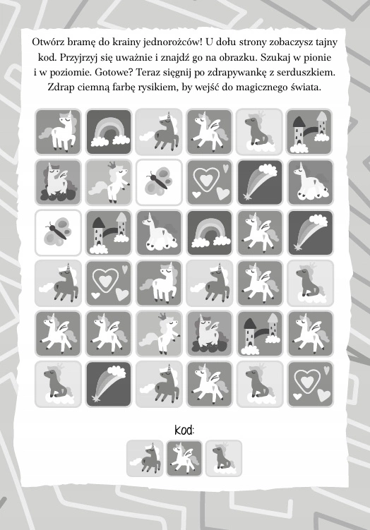• 6 kart zdrapek, a na nich: ukryte obrazki oraz pole do wydrapania wskazanych kształtów
