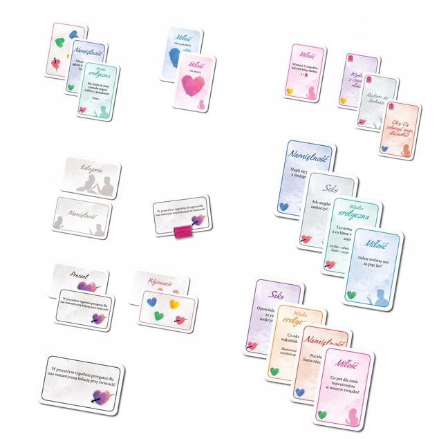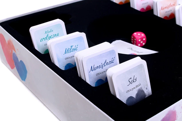 Podzielcie karty na dwa stosy (z pytaniami dla NIEJ i dla NIEGO), a następnie podzielcie karty z każdego stosu według kategorii (MIŁOŚĆ, SEKS NAMIĘTNOŚĆ i WIEDZA EROTYCZNA). Wylosujcie też po 3 karty prezentów i wybierzcie z nich po jednej. Każde z Was niech wylosuje po jednej karcie wyzwania.