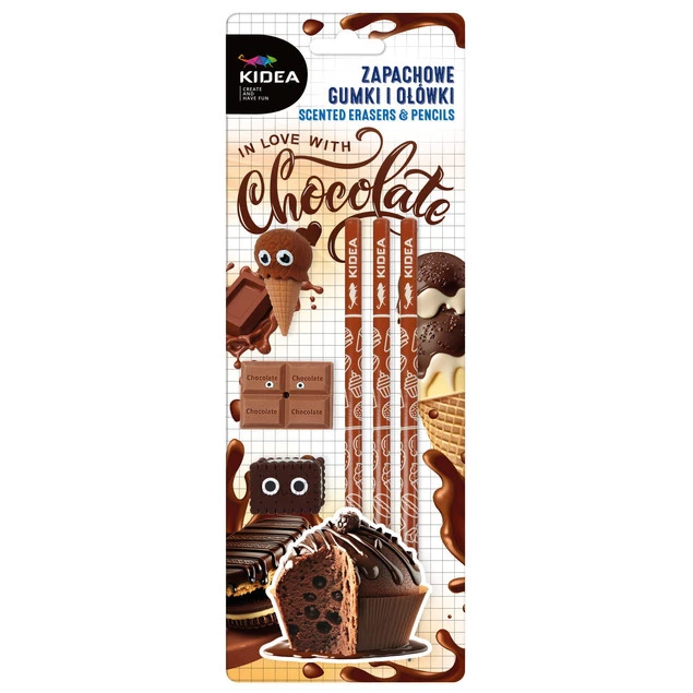Zapachowy niezbędnik Kidea o słodkim, czekoladowym aromacie, który zawiera 3 ołówki o twardości rysika HB oraz trzy smakowite gumki w kształcie babeczki, czekolady i ciasteczka.