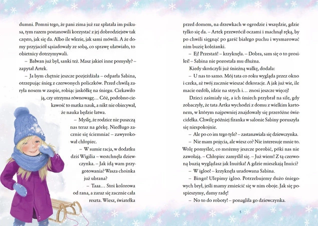 Sabinka i Artek bawili się w najlepszym na świecie igloo – najlepszym, bo ulepionym własnymi rączkami – gdy na podwórku rozpoczęło się światełkowo-bombkowe starcie ich rodziców. I trwało do momentu, gdy nastała ciemność… Czy dorośli zrozumieją, że i bez barwnych dekoracji do domów zawita prawdziwy duch świąt?