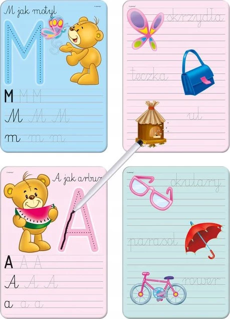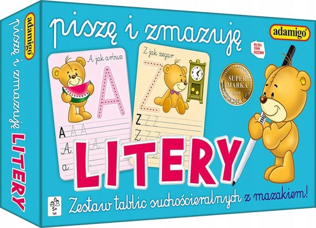 Każda z nich zawiera kilka wykropkowanych literek i wyraz, by dziecko mogło zapoznać się z ich pisownią. Pisanie mały przedszkolak może trenować do woli! W razie niepowodzenia wystarczy przetrzeć tablicę szmatką i można zacząć zadanie od nowa. Karty zadań zdobią wizerunki sympatycznego Misia i przedmiotu, nawiązującego do literki lub wyrazu które się na nich znajdują. Z zestawem PISZĘ I ZMAZUJĘ LITERKI ADAMIGO zdobywanie nowych umiejętności sprawi dziecku wiele radości.