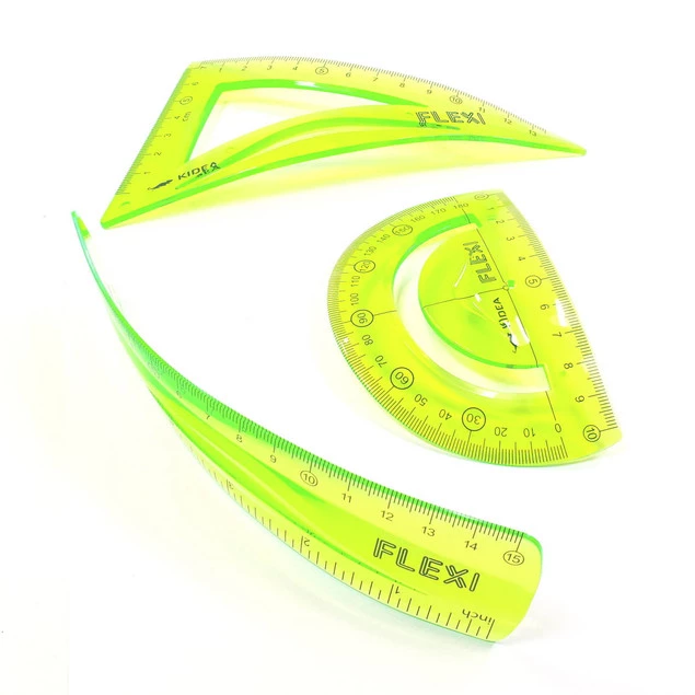 Zestaw geometryczny flexi przydatny szczególnie do pomiarów matematycznych. W zestawie 3 elementy: linijka 15 cm, ekierka, kątomierz, wykonane ze specjalnego, elastycznego tworzywa - odpornego na złamanie.