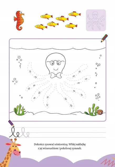 Idealna pozycja na początek! Dziecko rozwija sprawności manualne i intelektualne potrzebne do nauki pisania, kolorując, naklejając, rysując szlaczki, ozdabiając obrazki i przechodząc labirynty. Przejrzyste, duże ilustracje, prosty układ stron i ciekawe ćwiczenia pomogą w skupieniu i przyciągną uwagę na dłużej.
