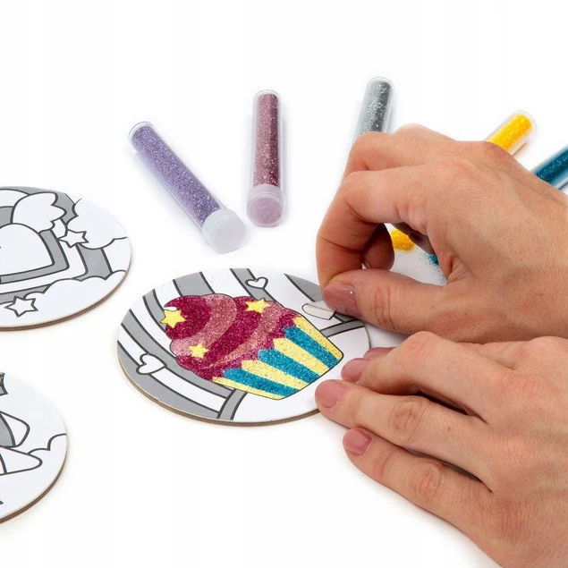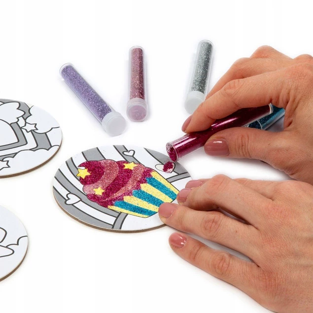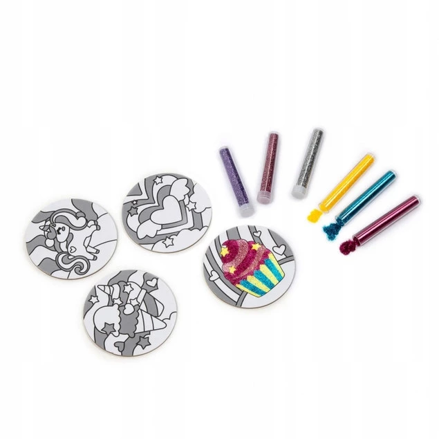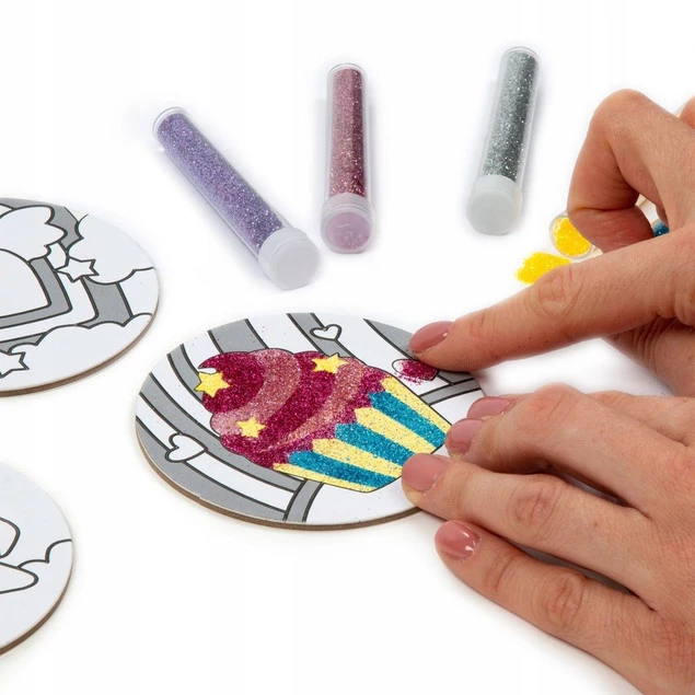 W zestawie znajdują się 4 podkładki pod kubek z różnymi, bajkowymi wzorami: babeczką, lodami, uskrzydlonym sercem i jednorożcem oraz 6 kolorów brokatów: dwa odcienie różu, fioletowy, niebieski, złoty i srebrny.