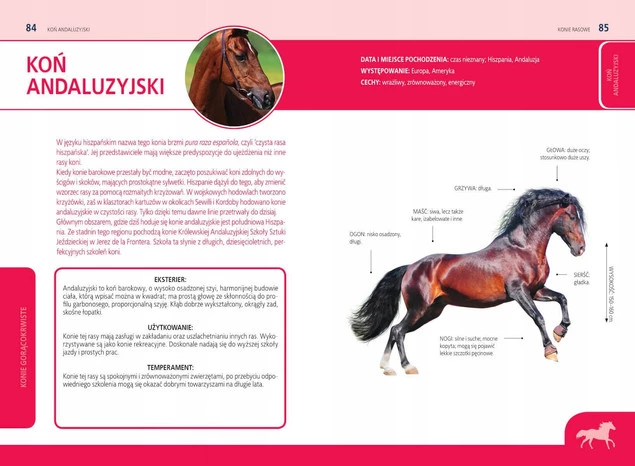 Prezentowana książka to znakomity poradnik dla osób, które chciałyby zgłębić wiedzę na temat tych zwierząt. Oprócz szczegółowych opisów ponad siedemdziesięciu ras w książce znalazły się informacje na temat anatomii konia, a także praktyczne porady, jak dbać o jego zdrowie i zapewnić mu najlepsze warunki.