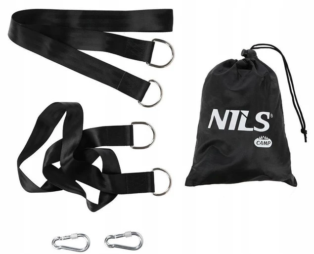 Zestaw lin NC1722 marki NILS CAMP to solidne, wytrzymałe pasy do zawieszania huśtawek, hamaków, czy foteli typu bocianie gniazdo w dowolnym miejscu i w krótkim czasie. Pasy są wykonane z materiału, który się nie przeciera, nie rozciąga się i cechuje się bardzo dużą wytrzymałością. Dodatkowo pasy zostały wyposażone w karabińczyki oraz stalowe pierścienie typu D, umożliwiające szybki i łatwy montaż bez użycia narzędzi.