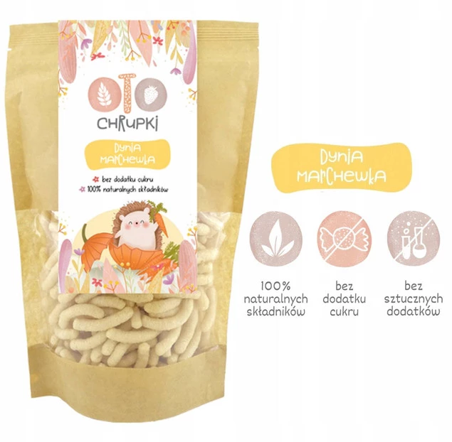 Chrupki Dynia-Marchewka - Tuptający jeżyk, jak na podróżnika przystało wybrał się na wędrówkę w poszukiwaniu najlepszych produktów, z których wyczarował nowy smak dla naszych orkiszowych chrupek! Na magicznej polanie znalazł wyśmienite marchewki, a tuż za pagórkiem zobaczył farmę, na której rosły najpiękniejsze dynie w dolinie. Jeżyk wiedział, że będzie to idealne połączenie smaku, zdrowia i natury!