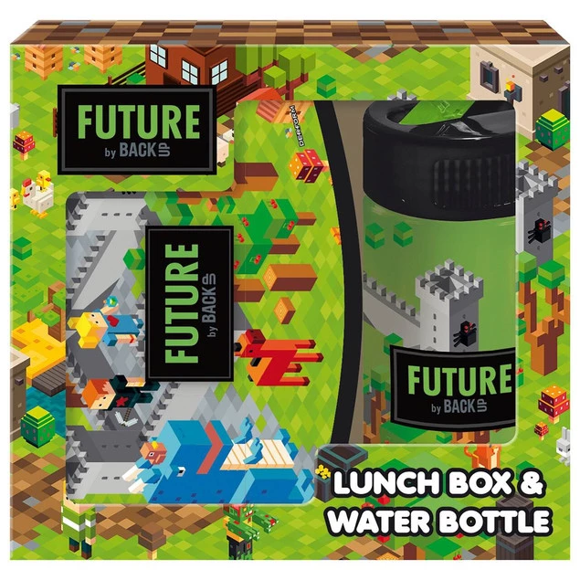 Praktyczny zestaw z bidonem i śniadaniówką z motywem pikselowej gry, który będzie niezastąpiony w szkole lub na wycieczce.