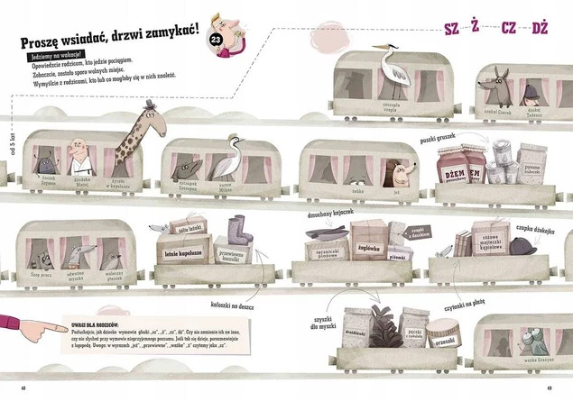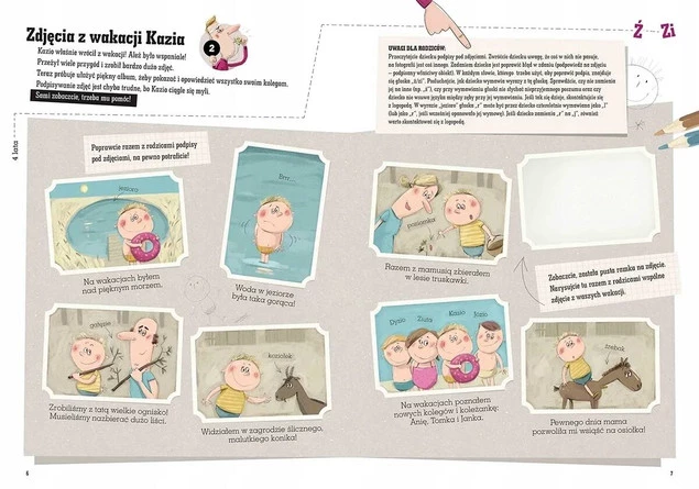 Na 64 stronach zebrano wiele wesołych ćwiczeń, podzielonych według wieku dziecka i stopnia trudności. Dotyczą one głosek, które w rozwoju wymowy sprawiają najwięcej kłopotu (m.in.: k, g, l, ś, ź, ć, dź, s, z, c, dz, sz, ż, cz, dż, r). Wykonując zawarte na kartach książki zadania, dzieci pracują nad poprawną artykulacją, a rodzice mają okazję do wspólnej zabawy, dzięki której dowiedzą się, czy rozwój wymowy malucha przebiega poprawnie, czy może należy zasięgnąć porady logopedy. Proponowane zadania zachęcają również do ćwiczenia sprawności grafomotorycznej i słuchu fonemowego oraz rozwijania wyobraźni twórczej dzieci.