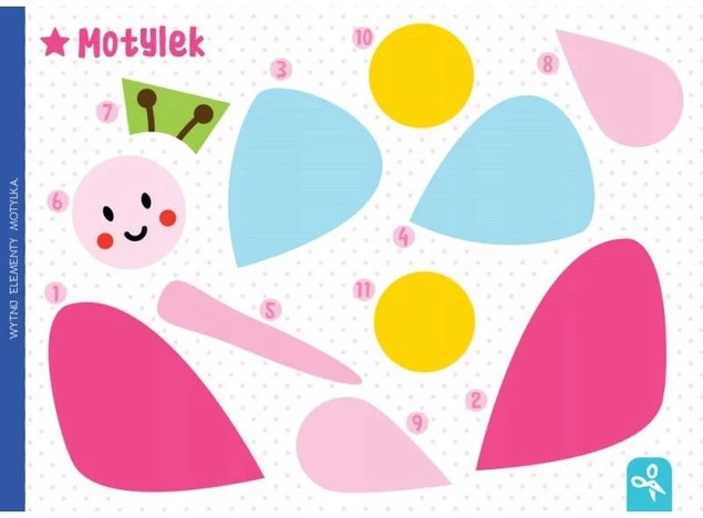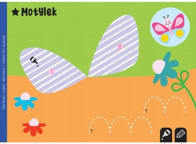 Jak z niej korzystać? Dziecko wycina proste elementy i przykleja w odpowiedniej kolejności tak, by powstał obrazek, a całość kompozycji dopełnia, rysując po linii przerywanej. Perforacja w książce ułatwia wyrywanie kart i wycinanie.